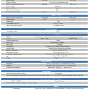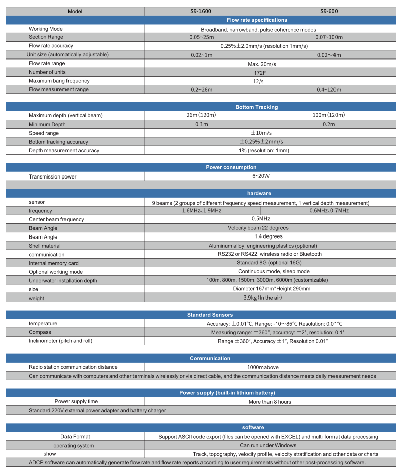 The S9 Series Acoustic Doppler Current Profiler (ADCP) is a professional high-precision acoustic device suitable for measuring flow velocity and flow rate in various complex working conditions such as oceans, rivers, channels, lakes, ports, etc. This device adopts advanced broadband, narrowband, pulse coherence and other acoustic signal processing technologies and bottom tracking technologies, which can accurately measure up to 172 layers of layered flow velocity and calculate the motion trajectory in real time through bottom tracking.