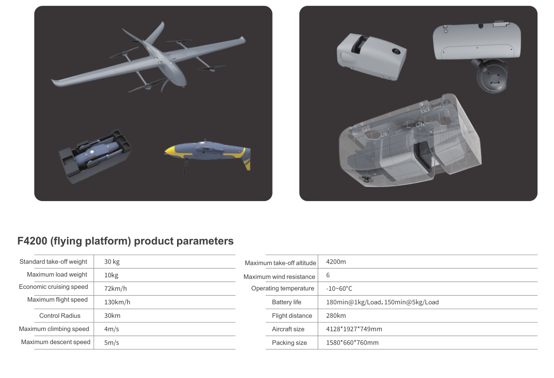 GreenZhizao has launched the new F4200 pure electric vertical take-off and landing fixed-wing UAV, which has the advantages of long flight time, large load capacity, multi-purpose, and can meet the needs of various application scenarios. Modular design allows for rapid deployment. Vertical take-off and landing, high-speed cruising, and autonomous take-off and landing on mobile platforms and complex environments, making it more widely applicable.