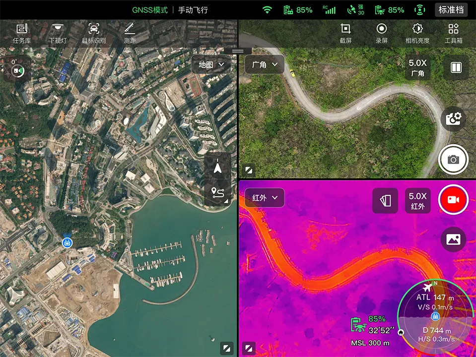 The Patrol UAV Max is equipped with a 160x zoom camera, ultra-sensitive wide-angle camera, infrared camera, and laser rangefinder. The model also features the ultra-low-light gimbal camera, which integrates ultra-low-light night vision, wide-angle, infrared, and laser rangefinding capabilities. The intelligent collaboration between multiple sensors ensures all-weather operation, making complex tasks easier than ever before.Multiple Task Modes for Enhanced Efficiency