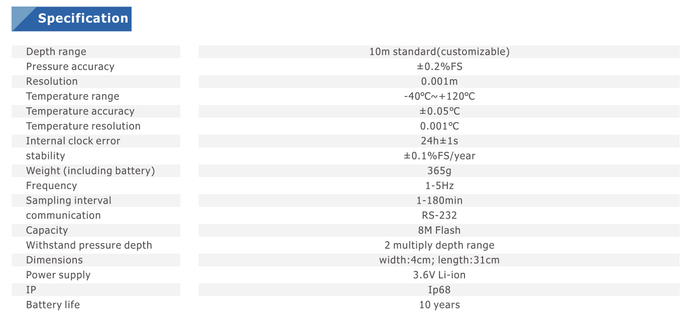 The S40 is a very compact self-contained tide gauge that can accurately measure changes in temperature and pressure. The product has high precision, small size and buit-in battery power supply. It can be easily installed on various objects such as seabed, trestle bridge, dock, and anchorage. It is widely used in marine research, harbor, dam monitoring and other long-term underwater survey. The tide gauge does not need an external cable when measuring, and can be suspended by a safety cable. When the recorded data needs to be downloaded, it can be easily removed from the measuring point and download the data.